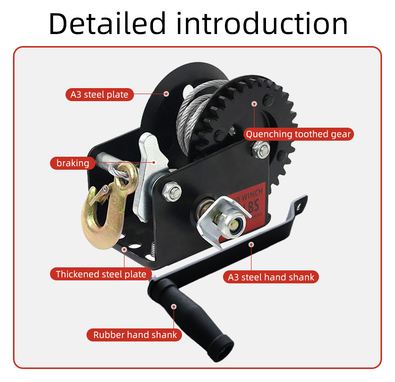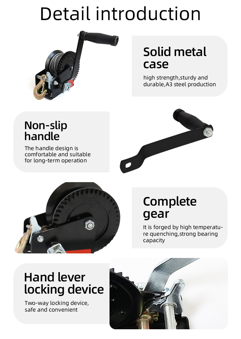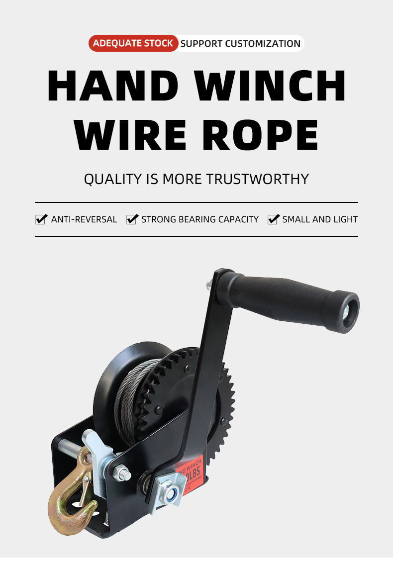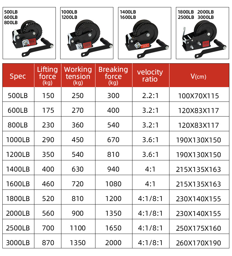 | Hand cranked wire rope winch | 500LB, 600LB, 800LB, 1000LB, 1200LB, 1600LB, 2000LB, 2500LB, 3000LB, 3500LB |