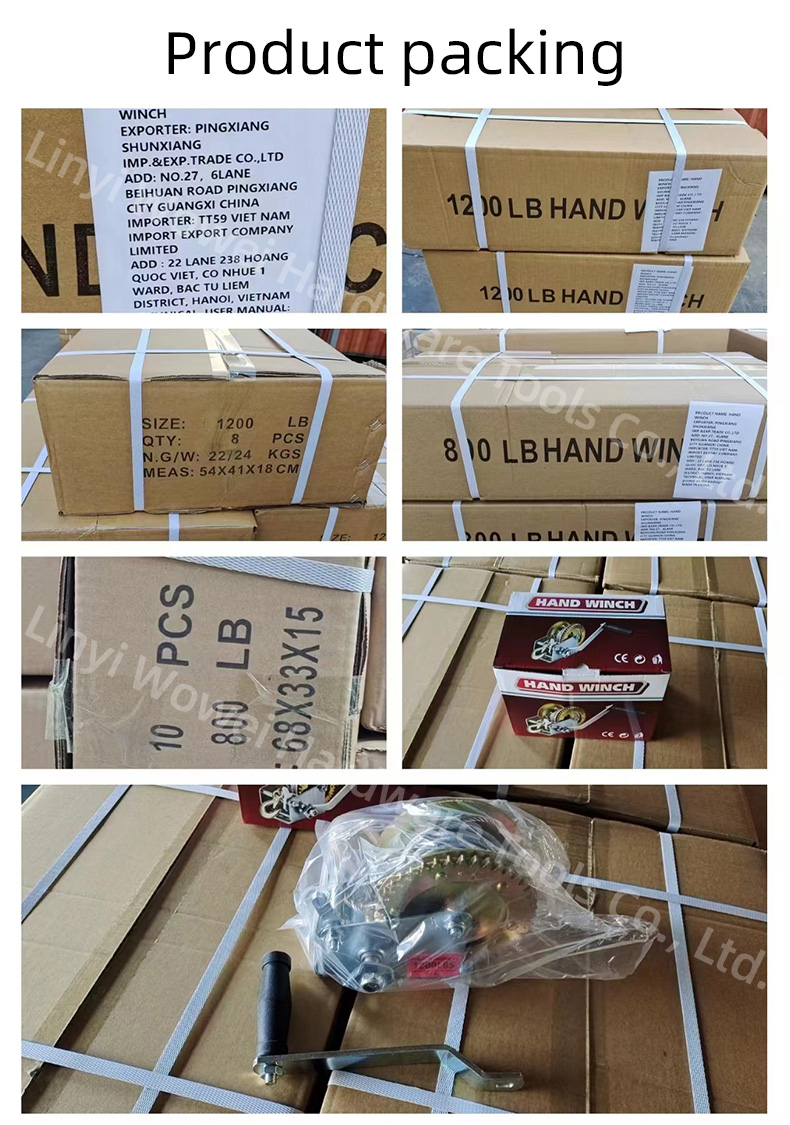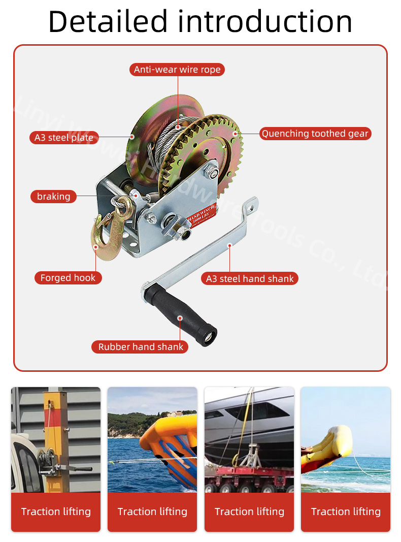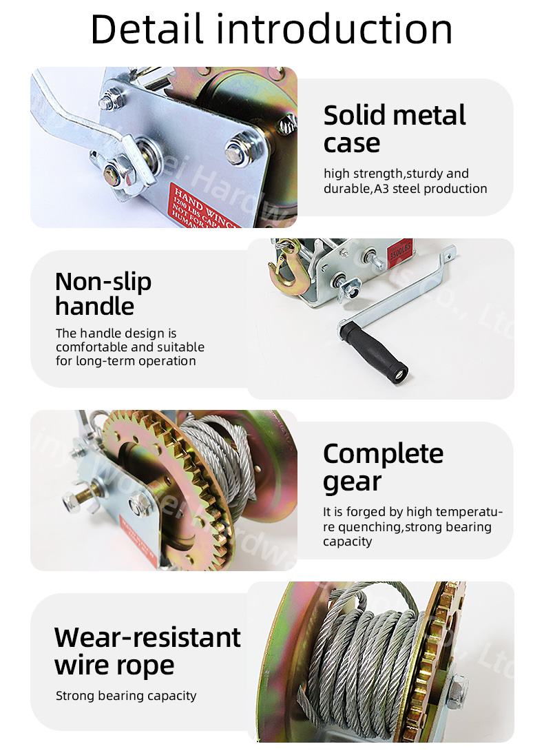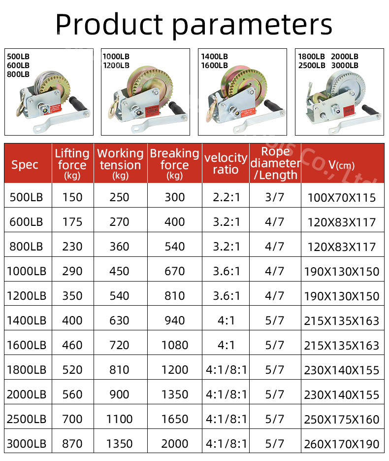 | Hand cranked wire rope winch | 500LB, 600LB, 800LB, 1000LB, 1200LB, 1600LB, 2000LB, 2500LB, 3000LB, 3500LB |
